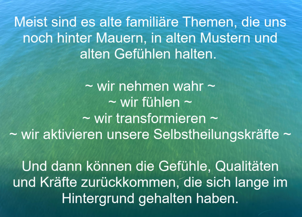 Die Teilnahme an all meinen Veranstaltungen – auch am Einzelsetting – geschieht in eigener Verantwortung. Sie dient der Aktivierung der Selbstheilungskräfte, der Erhöhung der Resilienz, dem Wohlbefinden, der Findung von Klarheit und Sinn sowie der Persönlichkeitsentwicklung. Sie ersetzt in keinem Fall die Diagnose oder Behandlung beim Arzt oder Heilpraktiker. D.h. ich gebe keine Heilversprechen.